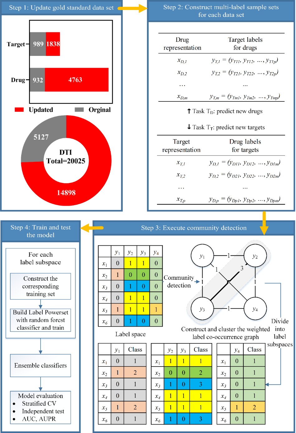 近日,在DTI-CDF方法研究的基础上,魏冬青教授与加拿大皇家学会院士、美国AAAS院士、加拿大卡尔加里大学Dennis Russell Salahub教授共同合作,进一步提出了多标签学习与社区检测方法(DTI-MLCD)。该研究中提到的基于网络标签空间划分的多标签多分类学习方法为DTI预测问题提供了一种新思路,同时为下游新药发现、老药新用等提供理论和实践依据。此外,该课题组还更新了自2008年以来由日本京都大学Yoshihiro Yamanishi教授创建并被业界同行广泛使用的金标准数据集,将DTI数量从5127增加到20025,数据量增幅了3倍,同时公开了数据集更新代码,与科研人员实时共享。