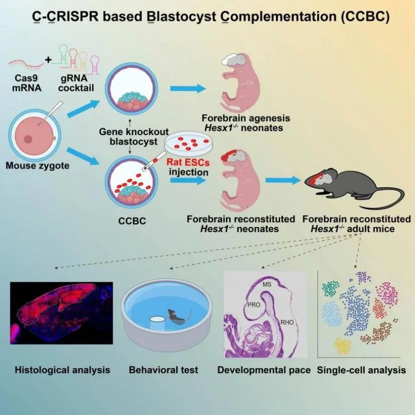传统的囊胚互补方法通常需要生成影响特定器官发育的杂合突变小鼠,扩繁这些小鼠以获得基因突变的囊胚,然后向这些突变囊胚里注入供体细胞以获得囊胚互补嵌合体。这一过程耗时耗力且不适用于杂合突变致死的基因。到目前为止,尚未发现能够支持异种前脑囊胚互补的基因。利用传统囊胚互补方法来验证某个基因是否支持前脑的囊胚互补是一个漫长的过程,即使对于孕期短和性成熟快的物种(例如,小鼠为10至26个月)。这对于繁殖周期更长的家畜和非人类灵长类动物来说更加困难。