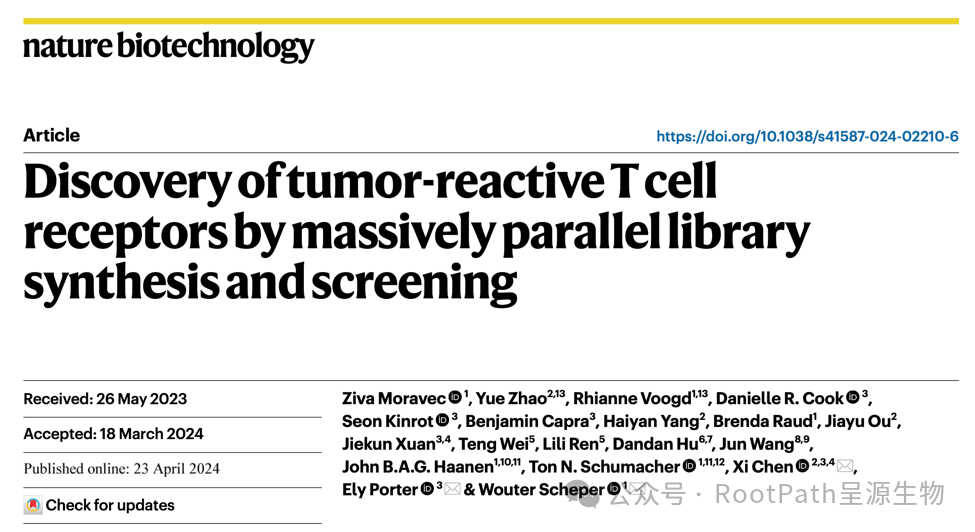 日前,荷兰癌症研究中心(Netherlands Cancer Institute, NKI)的Wouter Scheper、Ton Schumacher课题组与呈源生物(RootPath)团队合作在《自然-生物技术》(Nature Biotechnology, IF 68.2)上发表题为“Discovery of tumor-reactive T cell receptors by massively parallel library synthesis and screening”的研究论文,展示了呈源生物独有的超高通量基因合成技术如何助力个体化TCR药物的发现。六合彩下期预测 2005届本科校友、呈源生物联合创始人陈曦博士作为共同通讯作者领导了此项研究。