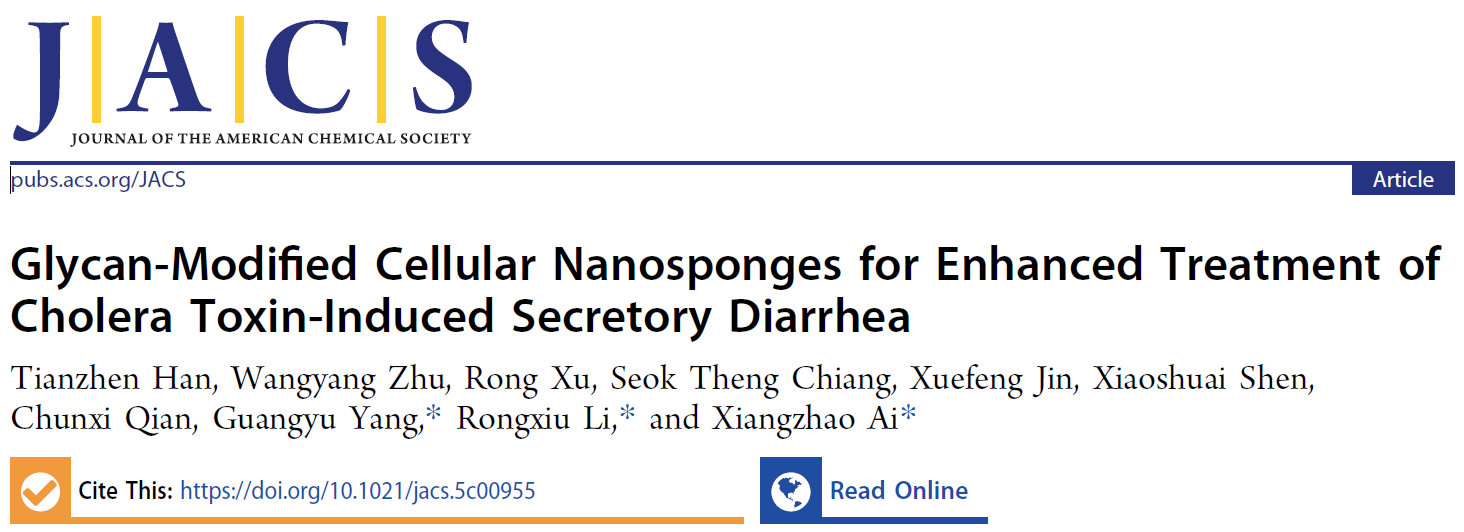 近日,国际权威期刊Journal of the American Chemical Society(JACS)在线发表了题为“Glycan-Modified Cellular Nanosponges for Enhanced Treatment of Cholera Toxin-Induced Secretory Diarrhea”的研究论文,六合彩下期预测 博士生韩田振为第一作者,艾相昭长聘教轨副教授、李荣秀教授和杨广宇研究员为共同通讯作者。