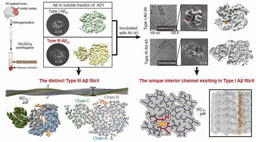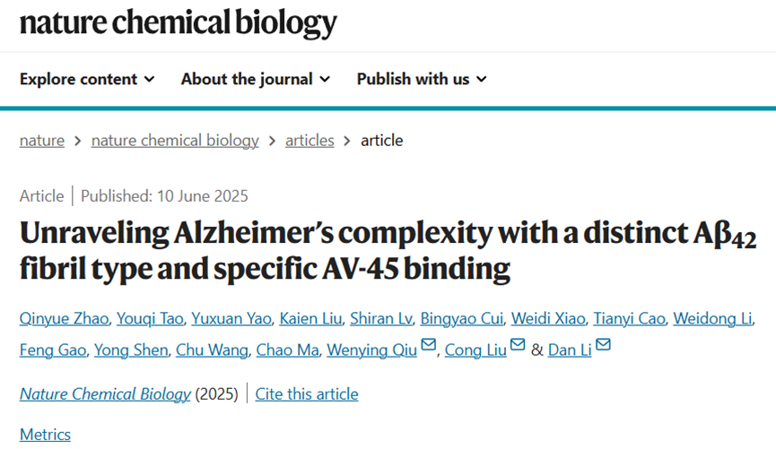 2025年6月11日,上海交通大学Bio-X研究院李丹团队、中国科学院上海有机化学研究所生物与化学交叉中心刘聪团队,联合中国医学科学院基础医学研究所仇文颖团队,在Nature Chemical Biology期刊上发表了题为“Unraveling Alzheimer's Complexity with a distinct Aβ42 Fibril Type and Specific AV-45 Binding”的研究论文。该工作在AD患者脑组织“可溶组分”中发现全新的Aβ42病理纤维聚集体类型(Type III),并首次阐明临床PET示踪剂AV-45识别Aβ42的分子机制,为AD的精准分子分型与新一代PET示踪剂的研发提供了理论依据与新思路。