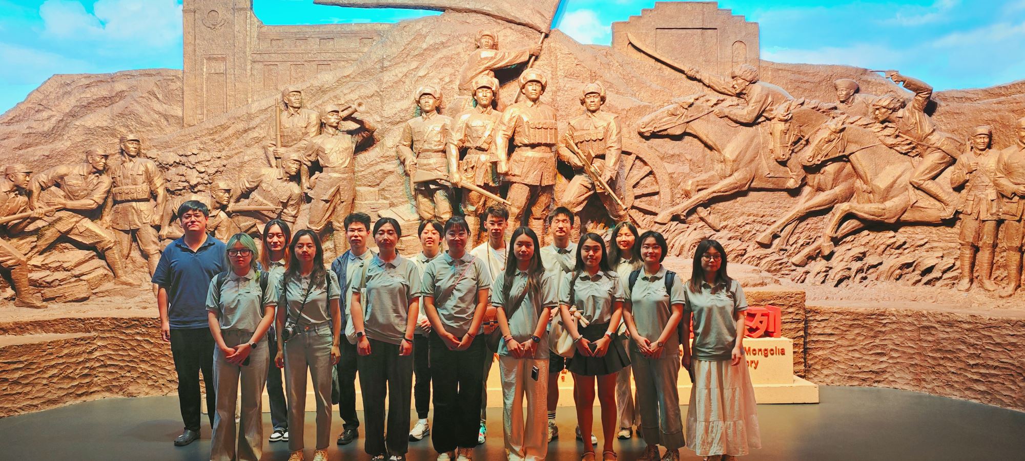 随后,实践团一行赴绥蒙抗日救国会旧址纪念馆开展了参观学习活动。成员依次参观了各个展区,通过一张张珍贵的老照片、一件件斑驳的文物,深入了解抗战时期绥蒙地区军民团结一心、共御外敌的感人故事。同学们驻足在一份份泛黄的历史照片前,仿佛穿越时空,感受到革命先辈们炽热的爱国情怀。“看到当年战士们用过的简陋装备,再想想他们创造的伟大胜利,深受感动、震撼!”支部成员在参观后感慨道。