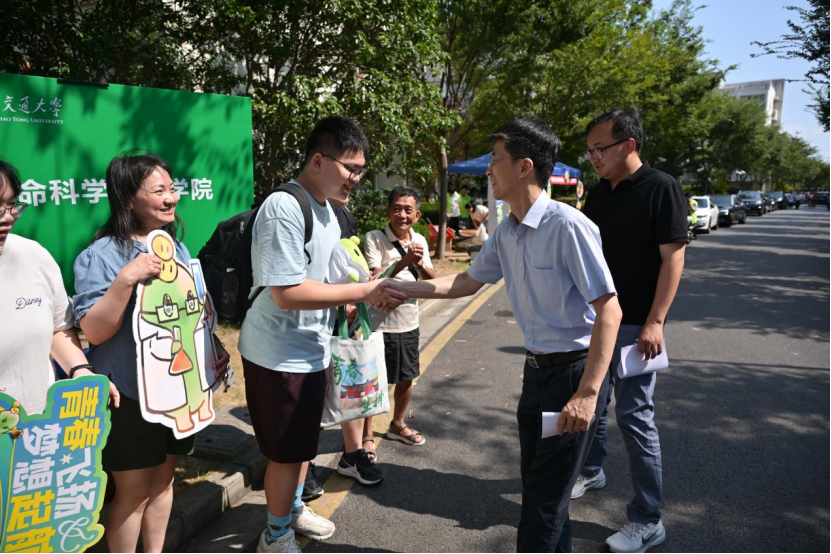 上海交通大学校长丁奎岭院士亲临迎新现场,指导迎新工作,并欢迎新同学的到来。