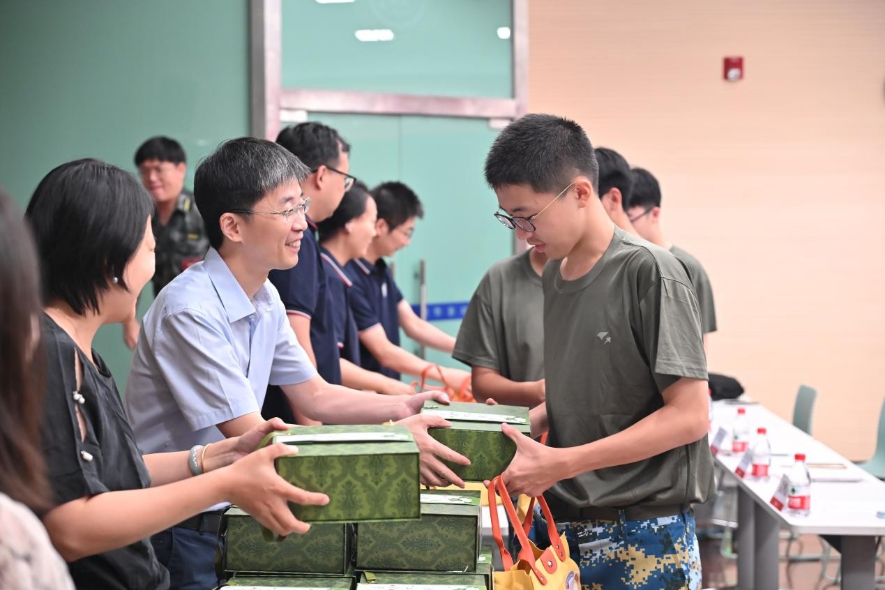 冒巍巍、张燕红和新生班主任代表学院为参训同学和教师发放慰问品,师生欢聚一堂,在热情洋溢的氛围中,本次军训中期慰问圆满结束。