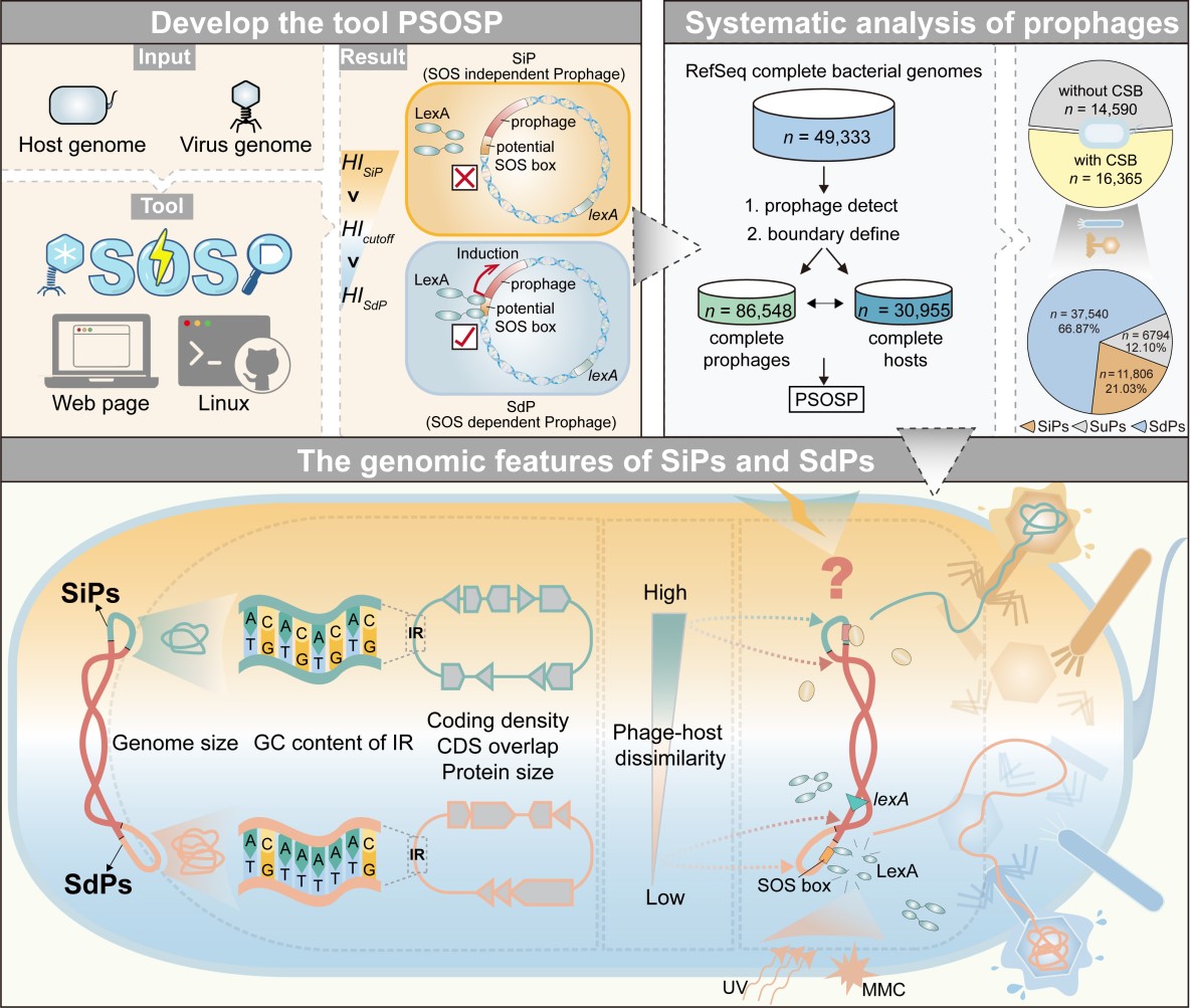 图1. PSOSP揭示细菌基因组中普遍存在具有独特基因组与宿主特征的SOS非依赖型原噬菌体摘要图