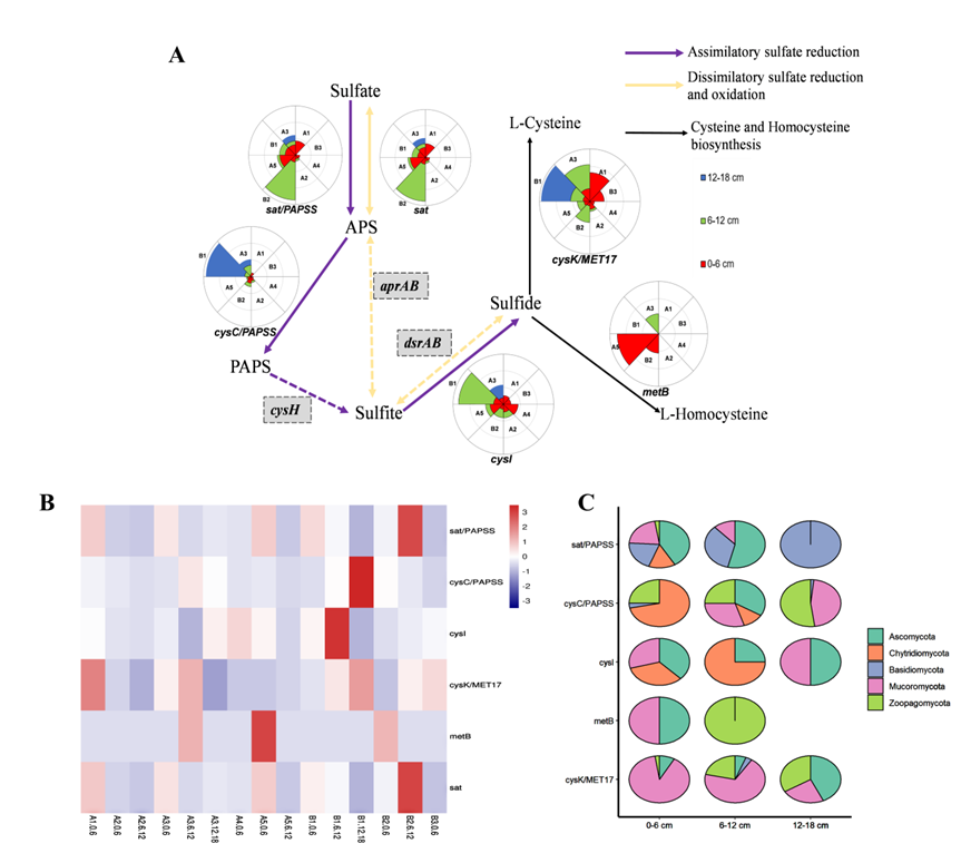 该研究从马里亚纳海沟深渊-超深渊过渡带区域的八个站点采集了三层沉积物样本(表层 0 - 6 厘米、中间层 6 - 12 厘米和深层 12 - 18 厘米),利用宏基因组学策略比较了这些不同站点、不同深度沉积物的真菌群落结构与碳、氮、硫元素循环潜力。结果显示,在马里亚纳海沟深渊-超深渊过渡带三个深度的沉积物中共检测到了 8 个真菌门,其中子囊菌门(Ascomycota)最为丰富,其次是毛霉菌门(Mucoromycota)和担子菌门(Basidiomycota),并检出微孢子虫(Microsporidia)和罗兹菌门(Rozellomycota/Cryptomycota)等稀有类群。马里亚纳海沟深渊-超深渊过渡带区域的南部和北部斜坡之间沉积物真菌群落组成与元素循环潜力没有显著性差异,但是在不同沉积层的精细尺度上的真菌群落组成和碳、硫、氮的生物地球化学潜力呈现出明显差异,这可能是由沉积物不同深度的理化性质差异性决定的(图1)。特别值得注意的是,基于真菌宏基因组数据揭示了同化硫酸盐还原(ASR)途径的关键基因——sat、cysI 和 cysC/PAPSS 催化过程,显示深海真菌在硫还原与含硫氨基酸合成等方面的重要作用。真菌的同化型硫酸盐还原酶(ASR)酶系、硫酸腺苷转移酶/三磷酸腺苷(ATP)硫酸酯酶(sat)、腺苷硫酸激酶(cysC)用于将硫酸盐转化为腺苷一磷酸(APS),亚硫酸盐还原酶(还原型烟酰胺腺嘌呤二核苷酸磷酸)血红素β组分(cysI)将亚硫酸盐转化为硫化物,最后这种硫化物能够被整合到氨基酸中,例如半胱氨酸和同型半胱氨酸(图2)。同时,研究还发现真菌由 NIT-6 介导的异化亚硝酸盐还原产氨途径,从而为原核微生物生长提供氮源。这些都表明深海沉积物真菌具有不同于原核生物的独特代谢路径。此外,研究还提示深海真菌与原核微生物群体之间具有功能上的互补性,组成元素循环网络,协同驱动深海元素循环(图3)。