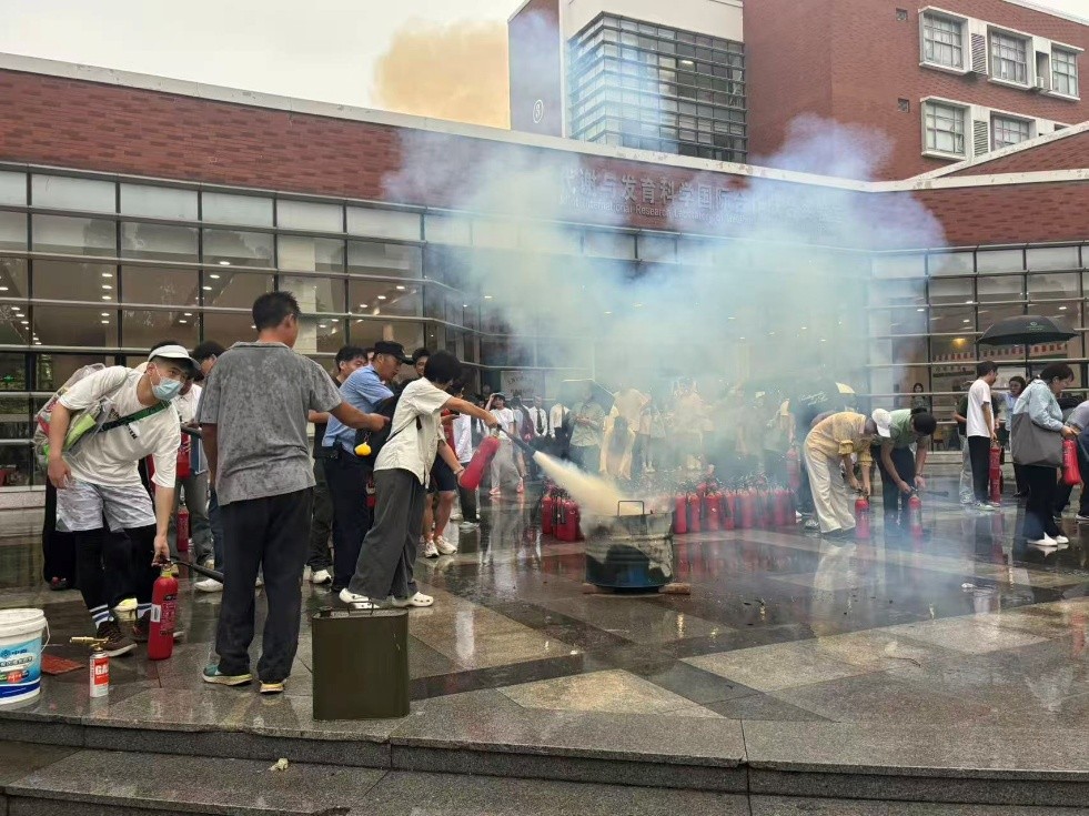 学校保卫处消防科科长所骋开展消防安全培训,重点讲解灭火器使用、初期火灾扑救技巧及应急处置要点。随后,在学院广场组织灭火演练,现场指导师生实践操作二氧化碳灭火器。