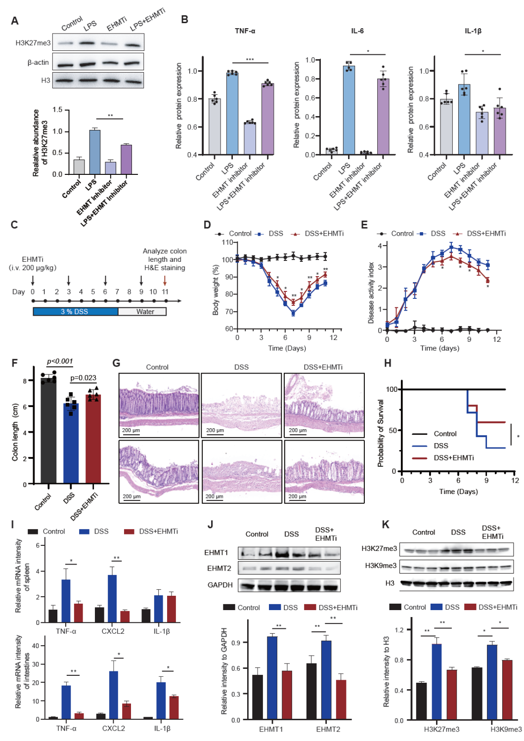 为了进一步阐明核酸结合蛋白在炎症性肠病中的调控机制,研究团队首先利用硫酸葡聚糖钠盐(DSS)诱导建立了小鼠结肠炎模型,观察到患病小鼠出现明显的体重下降、结肠缩短、脾脏肿大以及广泛的上皮损伤,并伴随CXCL2、IL-1β、IL-6 和 TNF-α 等促炎因子的显著升高。随后结合NABP-DIA技术,对胸腺与脾脏中的核酸结合蛋白质组进行了系统解析,结果显示炎症状态下组蛋白甲基化相关核酸结合蛋白(如EHMT1、EHMT2、EZH2、SUZ12)在脾脏中显著上调,进一步的组蛋白修饰质谱结果证实了H3K27me3、H3K9me3等组蛋白甲基化修饰在结肠炎小鼠中发生了显著变化。功能验证实验表明,EHMT抑制剂能够缓解DSS小鼠的体重下降,同时提高急性模型小鼠的存活率。以上结果表明,脾脏核酸结合蛋白的重塑与异常组蛋白甲基化伴随炎症性肠病的发生,而靶向EHMT可有效缓解炎症,成为潜在的治疗策略,相关结果如图3所示。
