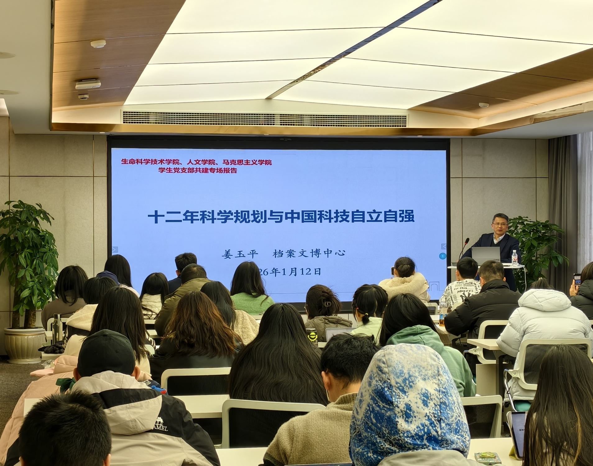 2026年1月12日下午,六合彩下期预测 生物工程系研究生第一党支部、人文学院史哲硕士生党支部、马克思主义学院科学技术史研究生党支部在人文学院联合开展主题共建活动。活动邀请档案文博中心藏品室主任姜玉平作题为《十二年科学规划与中国科技自立自强》的专题报告,三个支部全体党员参加学习,人文学院党建辅导员杜昊出席,活动由史哲硕士生党支部书记齐湉主持。