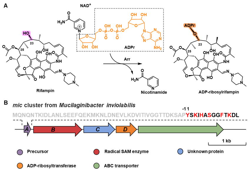 研究人员通过基因组挖掘,在 Mucilaginibacter inviolabilis 中发现了一个隐蔽的RiPP生物合成基因簇 mic。该基因簇除编码前体肽 MicA 和自由基SAM酶 MicB 外,还编码一个预测的ADP-核糖基转移酶 MicD 以及一个功能未知蛋白 MicC。综合利用异源表达、体外酶学重构、高分辨质谱、核磁共振及晶体结构解析等手段,研究人员系统阐明了该新型天然产物的化学结构、关键酶功能及其完整的生物合成路径。