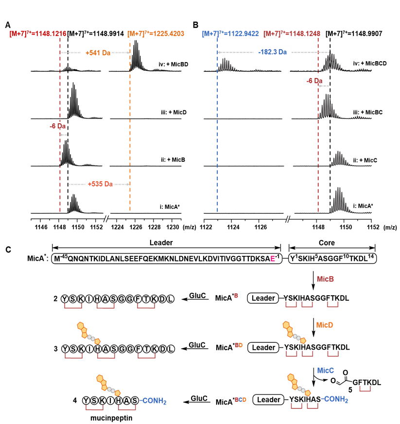 研究表明,minviopeptin的生物合成遵循严格的“MicB–MicD–MicC”串联修饰级联:MicB首先催化前体肽形成三重交联骨架;随后,MicD在该刚性骨架基础上催化发生ADP-核糖基化修饰;最后,α-酮戊二酸依赖非血红素铁酶MicC催化肽链发生氧化性N–Cα键断裂,生成带有C端酰胺化特征的成熟产物。这一发现揭示了一种前所未有的酶学协作模式。