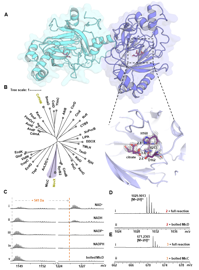研究人员还成功解析了MicC的晶体结构。结果显示,MicC具有典型的αKG依赖非血红素铁酶的双链β螺旋折叠特征,并包含保守的 2-His-1-Asp 催化三联体。这一结构基础为深入理解其催化氧化断裂及酰胺化反应的分子机制提供了关键线索,同时也扩展了αKG依赖酶在天然产物生物合成中的已知反应类型。