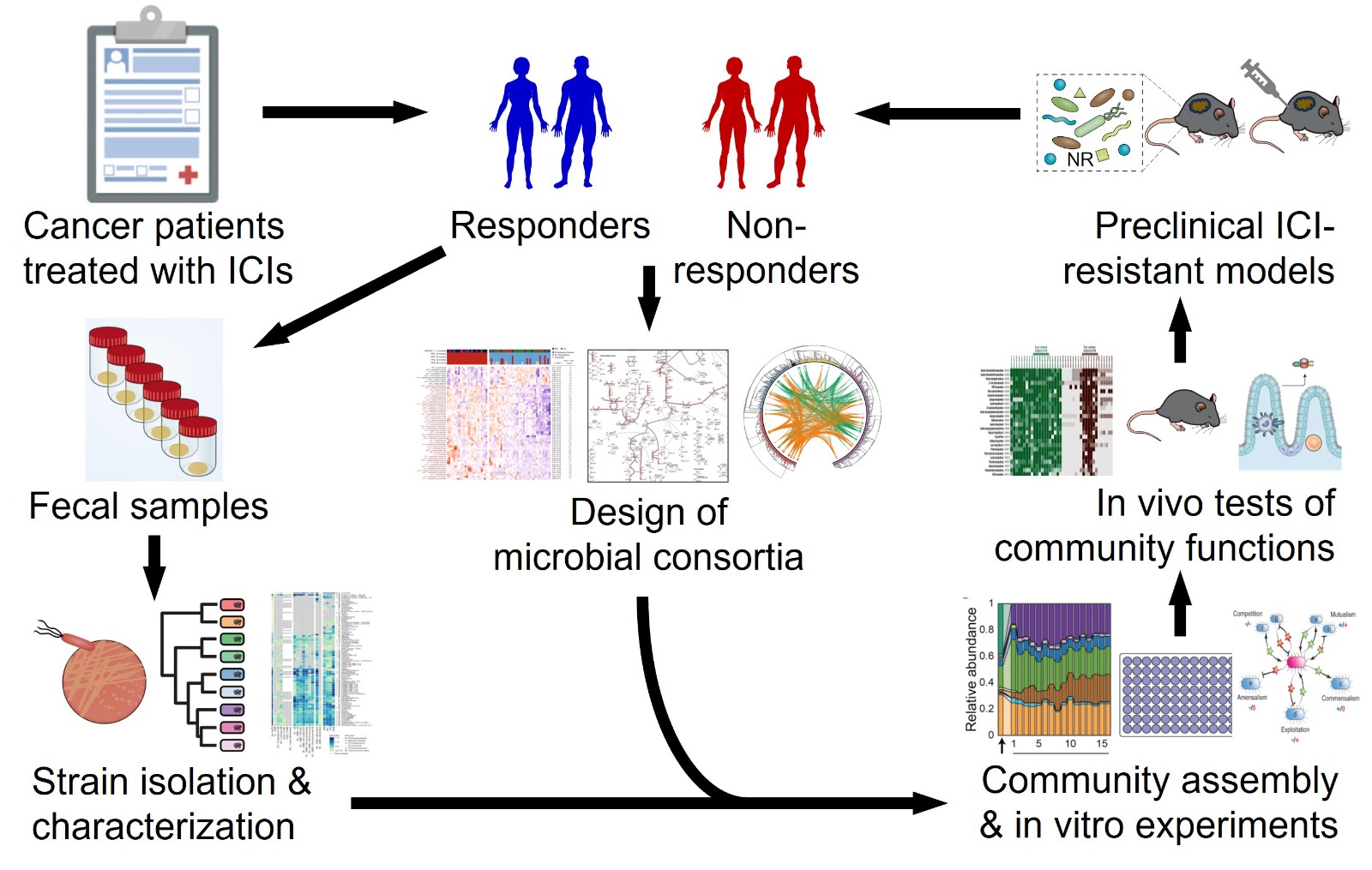 (1)肿瘤治疗的合成微生物学研究。免疫检查点抑制剂(immune checkpoint inhibitors,ICIs)为许多肿瘤患者带来福音,已获批用于多种癌症治疗,但是该治疗的获益人群有限。近期研究表明肠道菌的组成与ICIs临床疗效密切相关,粪菌移植在小鼠模型和少数临床患者中的实践结果预示肠道菌组成的改变可以克服ICIs耐药。为了扩大肿瘤免疫治疗的获益人群,我们基于临床样本,采用自下而上(bottom-up)的合成生态学策略,设计与构建肠道菌组合,研究组合菌引起的肠道菌群生态的改变以及对宿主免疫的调节作用,探讨该肠道菌组合对肿瘤ICIs疗效的影响;同时设计与构建工程细菌,用于肿瘤及其它疾病治疗。